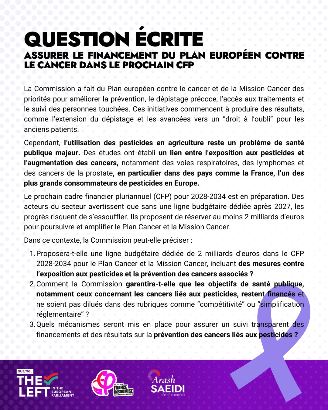 1.La Commission compte-t-elle proposer, dans le projet de CFP 2028-2034, une ligne budgétaire d’au moins 2 milliards d’EUR spécifiquement réservée au plan européen pour vaincre le cancer et à la mission «Cancer»?