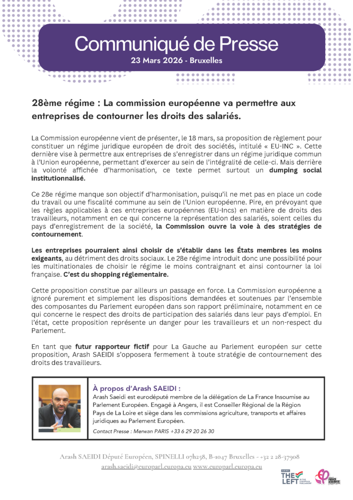 La Commission européenne vient de présenter, le 18 mars, sa proposition de règlement pour constituer un régime juridique européen de droit des sociétés, intitulé « EU-INC ». Cette dernière vise à permettre aux entreprises de s’enregistrer dans un régime juridique commun à l’Union européenne, permettant d’exercer au sein de l’intégralité de celle-ci. Mais derrière la volonté affichée d’harmonisation, ce texte permet surtout un dumping social institutionnalisé.