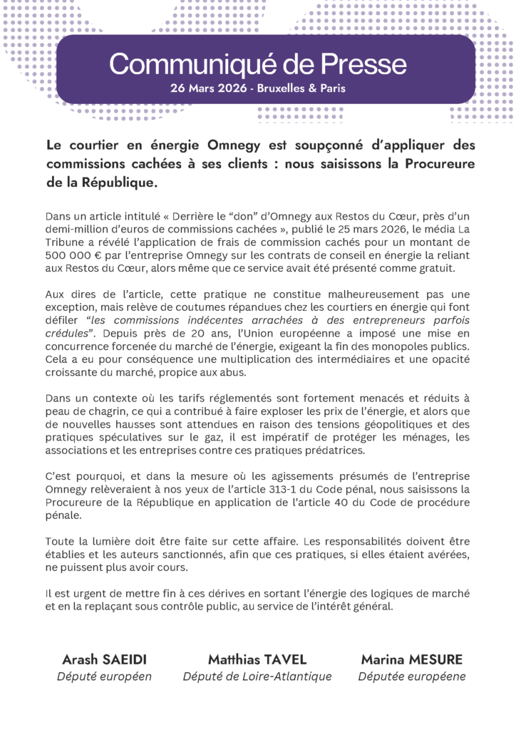 Dans un article intitulé « Derrière le “don” d’Omnegy aux Restos du Coeur, près d’un demi-million d’euros de commissions cachées », publié le 25 mars 2026, le média La Tribune a révélé l’application de frais de commission cachés pour un montant de 500 000 € par l’entreprise Omnegy sur les contrats de conseil en énergie la reliant aux Restos du Coeur, alors même que ce service avait été présenté comme gratuit.